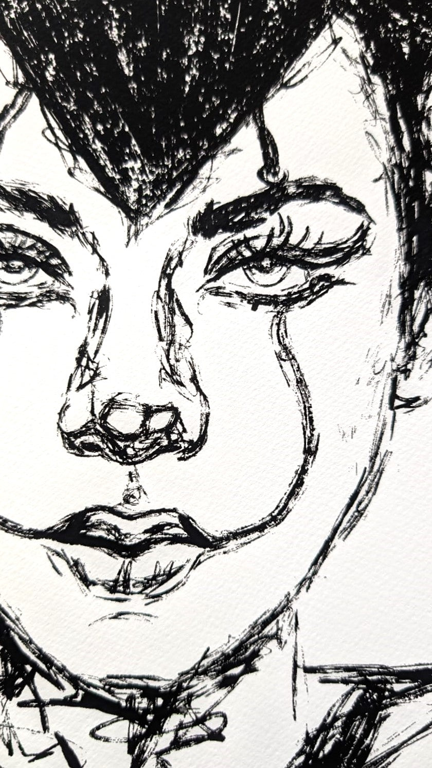 Her face is a mask and a truth at once: an enigma drawn in the ink of intuition.